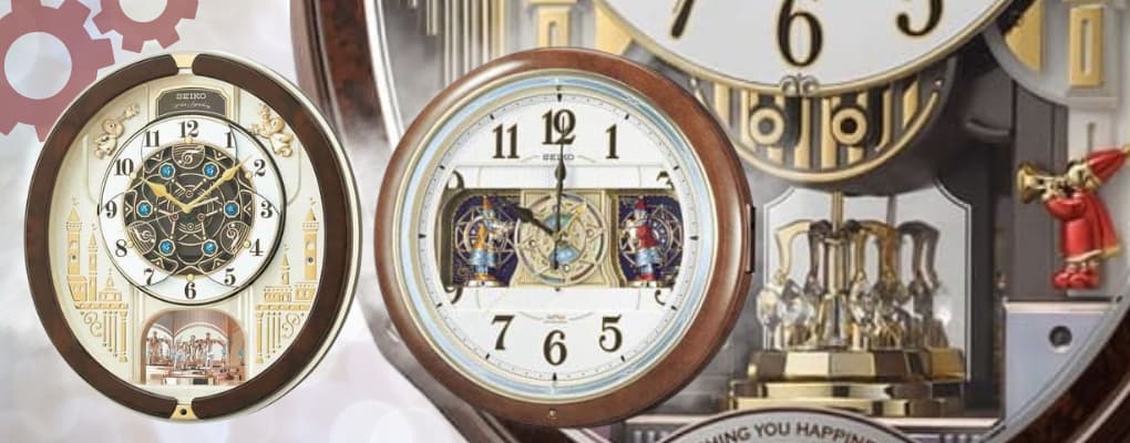 代表的なものには、メロディとともに文字盤が回転するもの、扉が開いて人形や動物が登場するもの等がございます。